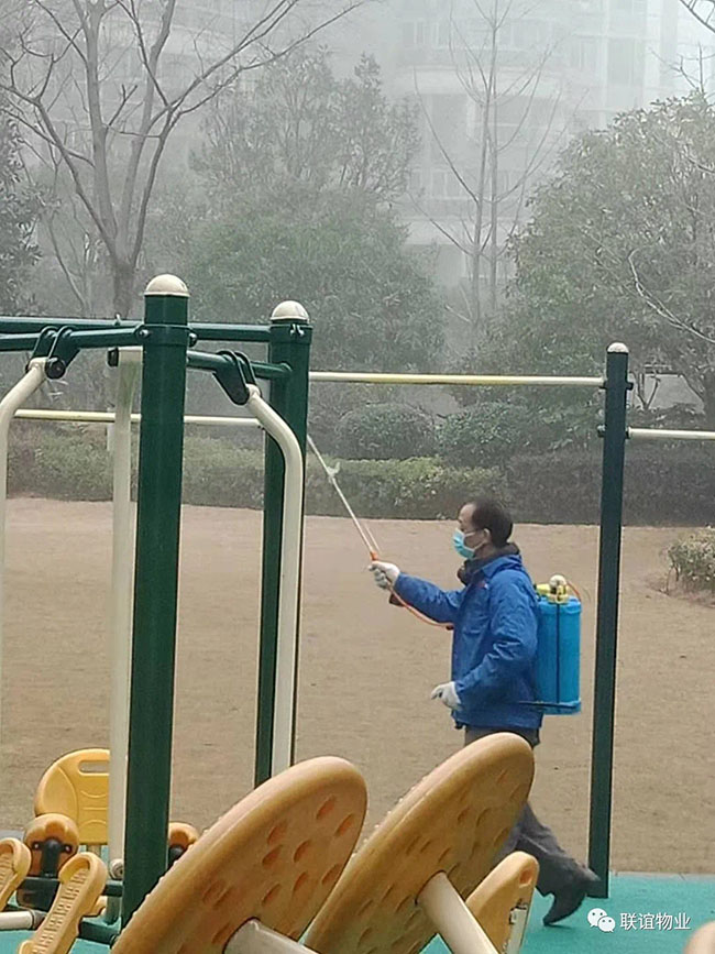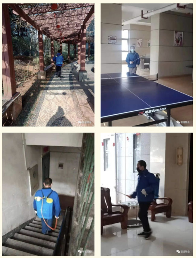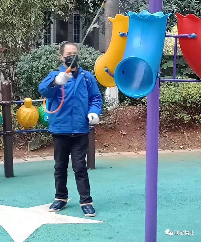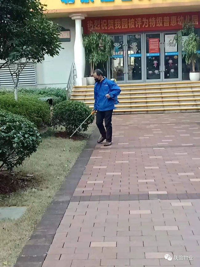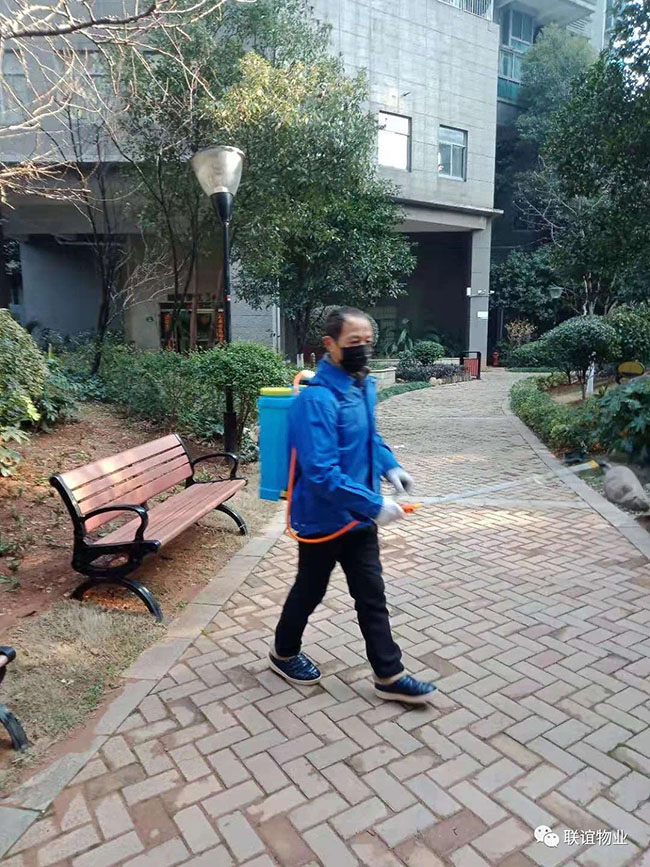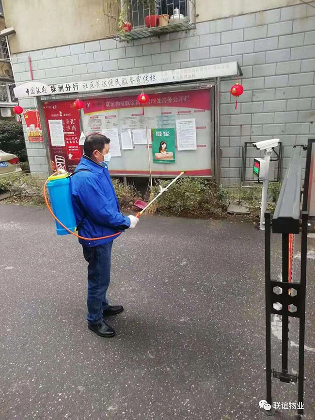 1月30日早上8点不到,他带上他的伙伴易跃庭师傅,两位绿化师傅身着工装背上喷雾器,二话不说,就默默地承担了为联谊物业四个小区做好现场消杀的工作。当时,因株洲的疫情尚不明朗,公司还没有来得及为一线的员工配备防护服。他们身着的蓝色的工装,不知道的人,还以为是天元区疾控中心的医务人员,知道真相的同事都纷纷为他们点赞。