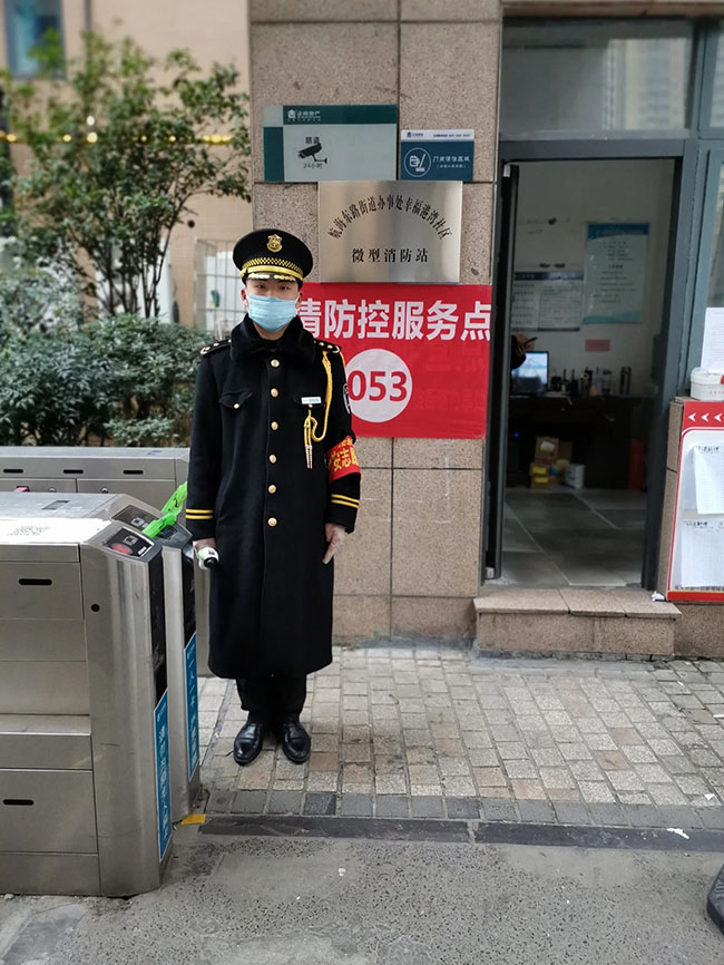每天清晨,他早早来到门岗处,认真消毒,做好日常出入检查,虽然天气寒冷,但万众一心,终将温暖我们的城市。