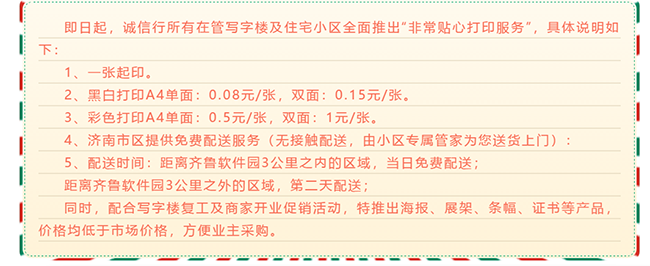 不仅如此,针对家中有小朋友需要上网课打印资料;阶段性复工,企业开业要宣传,疫情防控要宣传,条幅、海报、名片、彩印都没办法印刷的情况,诚信行专门联合中国最大的互联网印刷企业——世纪开元,在自己所有在管写字楼及住宅小区全面推出“非常贴心打印服务”。