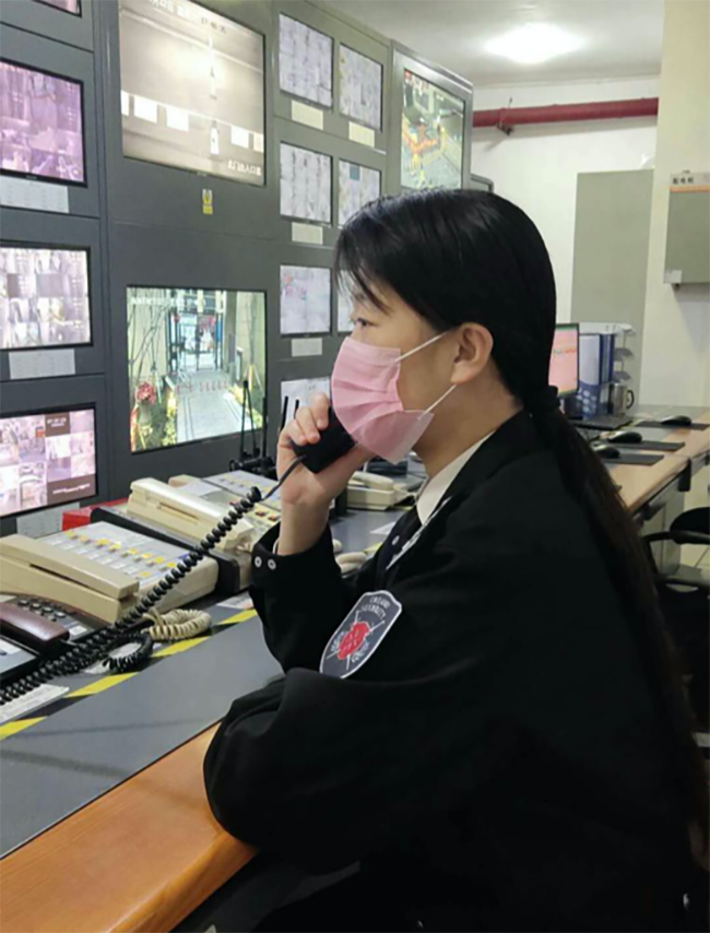 消控领班大部分时间要和监控器打交道,除了承担小区安全监控任务,疫情期间,杨盛慧还要做好“口罩跟踪”的工作,楼门口、电梯间,只要发现有未佩戴口罩的业主,杨盛慧就要立刻拨通对讲,提示业主正确戴好口罩;对于没有对讲的公共区域,则要立刻通知巡逻岗去寻找未佩戴口罩的业主,直到业主佩戴好才算结束。业主们开玩笑地说:“园区服务真贴心,连监控都是活的,这样全方位的监控肯定能战胜病毒!”