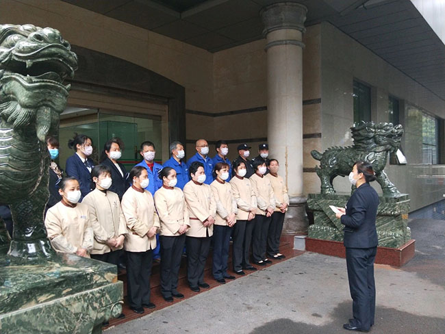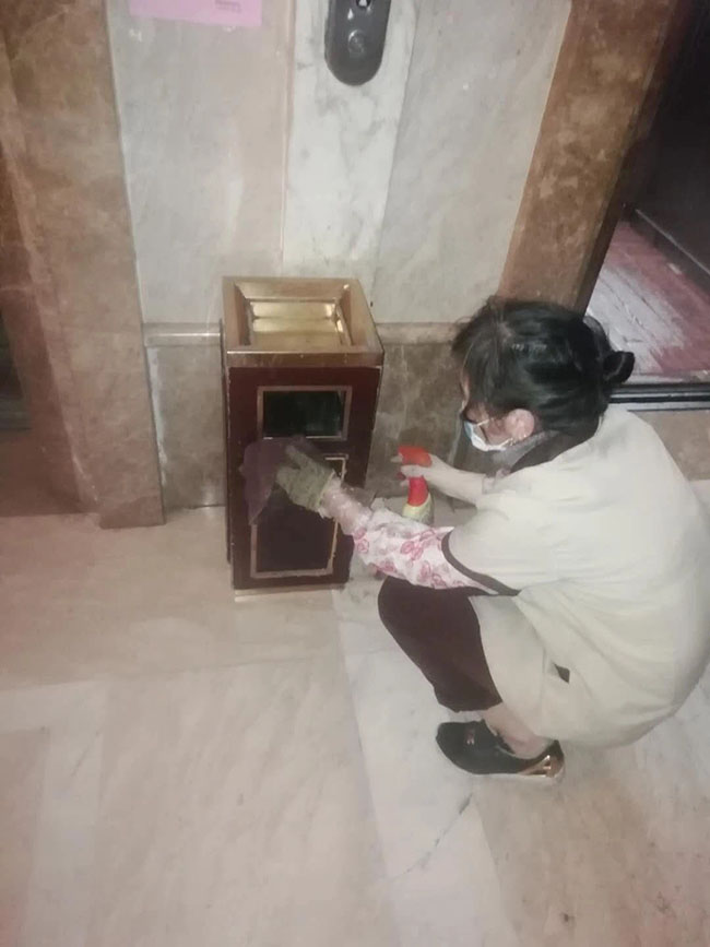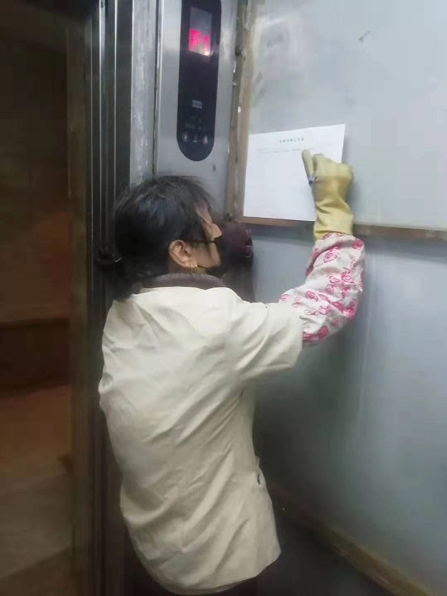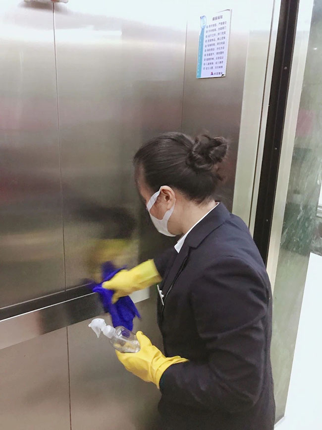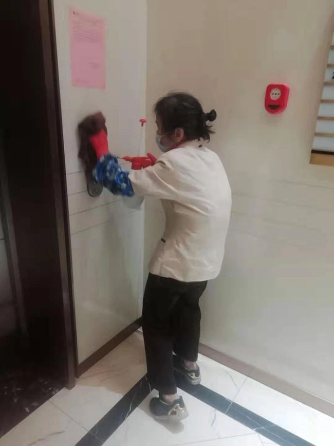 疫情启动一级防控以来,她第一时间就组织召开“防控疫情部署工作会议”,安排各班组人员具体工作及要求,制定周到严密的防疫措施。从加大公共区域消毒频次、重点对业主触点高频区域消毒,对进出人员测温、设置快递暂存点到办公室整体消毒,数百间办公室,张春妹经理都仔仔细细检查,确保每一间都消毒干净,保障甲方干部可以安心上班。同时,她还从细节入手,在电梯轿厢内放置电梯按钮一次性专用纸巾并粘贴《电梯乘坐温馨提示》与“电梯消毒台账”;实行严格的责任制,一级对一级检查,一级对一级负责,落实到每个员工。这些看起来繁琐、繁重的工作则是张春妹经理每天带领员工严格执行的常规任务,有任何马虎对她来说都是不可原谅的,因为她知道任何疏忽都可能危及到业主的生命安全。