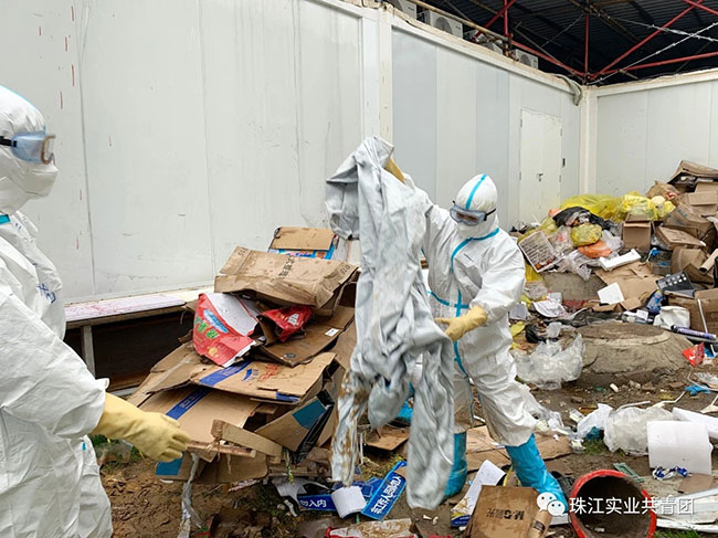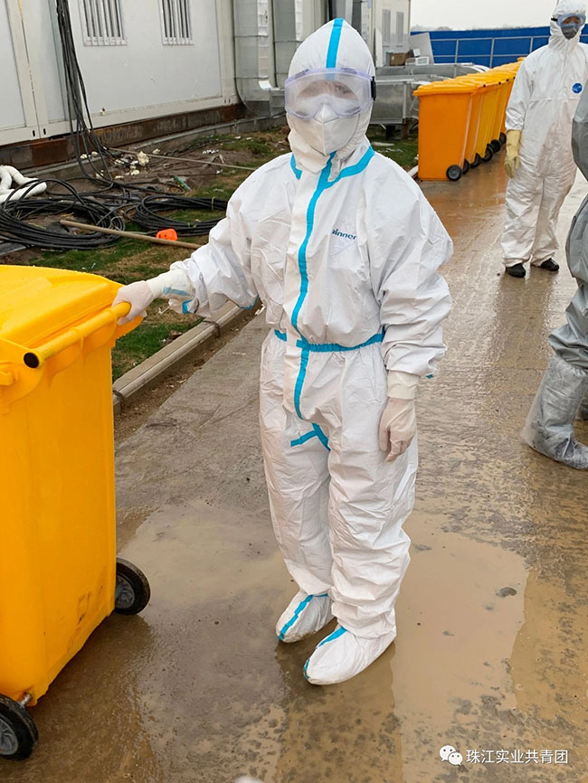 珠江物业志愿服务队主要负责火神山医院所有垃圾(包括医废、建筑、生活,以及餐余垃圾)的归类清运及后续消杀工作。男队员都很绅士,主动揽起装桶、拖运等重活儿。鲍雨薇和另外一名女队员冯莹只需负责垃圾收捡、垃圾桶管理、物资调配,以及队员们的后勤保障。但是,一堆堆医用垃圾需要快速收捡,一个个新病区交付后留下的建筑垃圾有待及时清运,鲍雨薇和队友们像一支支高速运转的陀螺,奔忙在医院的各个角落,一天要来回拖运20多公里,清理出垃圾300多桶。