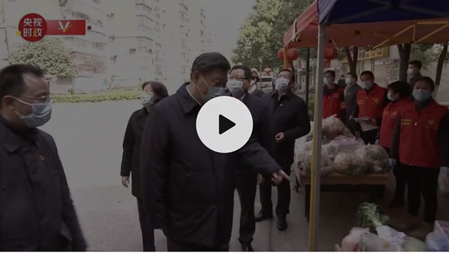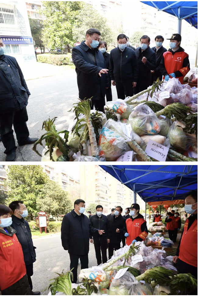 在社区生活物资集中配送点,习近平详细询问米面粮油和新鲜蔬菜水果等生活物资的采购和供应情况,强调要千方百计保障好群众基本生活。在察看社区警务室、卫生服务站、物业中心等运行情况后,习近平来到社区党群服务中心,了解社区实行网格化管理、联防联控、群防群治工作情况,对他们的工作表示肯定。