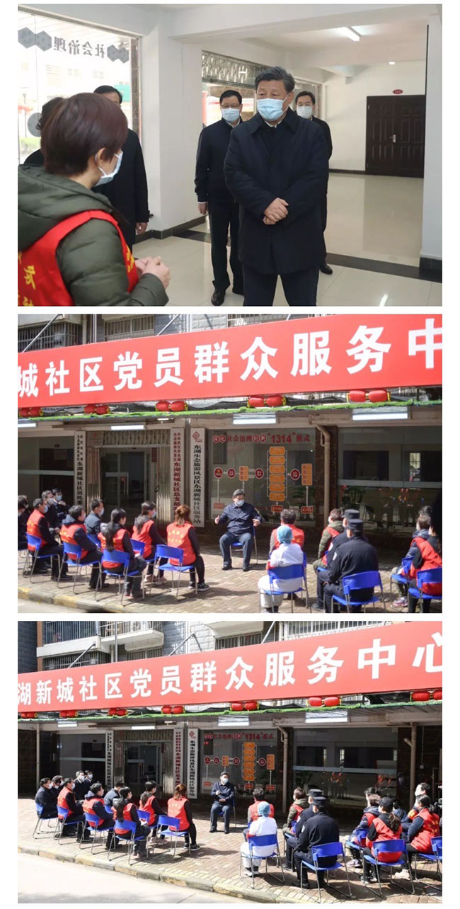 在社区党群服务中心,习近平同社区工作者、基层民警、卫生服务站医生、下沉干部、志愿者等亲切交流。习近平强调,社区作为防控的最前线,肩负的任务十分繁重,参与社区防控工作的同志们工作十分辛苦。大家夜以继日、不辞辛劳、默默付出,悉心为群众服务,为遏制疫情扩散蔓延、保障群众生活作出了重要贡献,展现了武汉党员、干部不怕牺牲、勇于担当、顾全大局、甘于奉献的精神。抗击疫情有两个阵地,一个是医院救死扶伤阵地,一个是社区防控阵地。坚持不懈做好疫情防控工作关键靠社区。要充分发挥社区在疫情防控中的重要作用,充分发挥基层党组织战斗堡垒作用和党员先锋模范作用,防控力量要向社区下沉,加强社区防控措施的落实,使所有社区成为疫情防控的坚强堡垒。打赢疫情防控人民战争要紧紧依靠人民。要做好深入细致的群众工作,把群众发动起来,构筑起群防群控的人民防线。