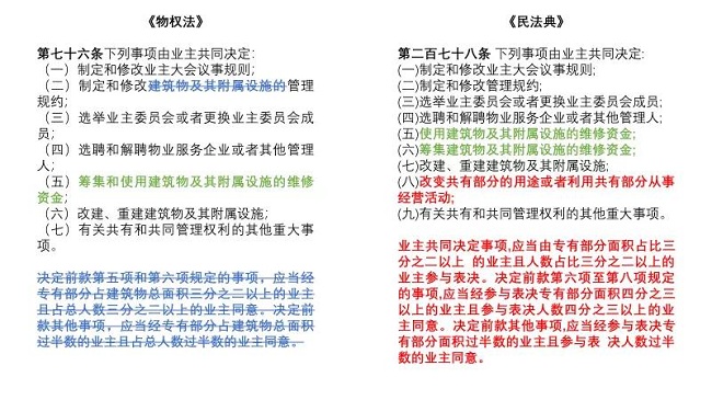 《民法典》第278条相较于《物权法》第76条,对全体业主表决事项、参与程度、“双多数”规则均进行了调整。如下为《物权法》、《民法典》相关条款对比: