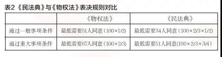 举例说明以上变化。假设某小区有100套房,每个业主各有1套房且面积相同。表决规则的变化详见下表2: