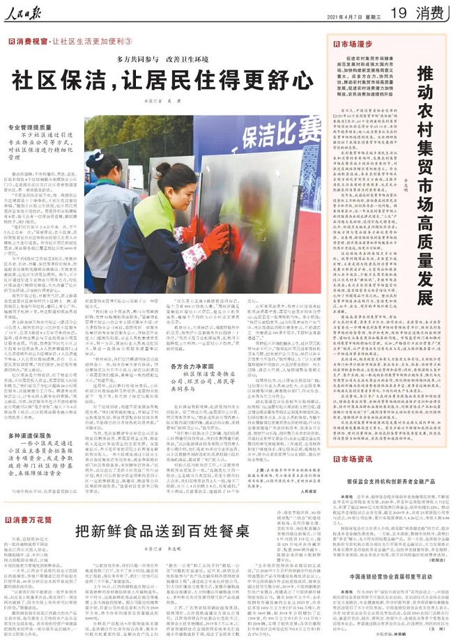 今年的《政府工作报告》提出,发展社区养老、托幼、用餐、保洁等多样化服务,加强配套设施和无障碍设施建设,实施更优惠政策,让社区生活更加便利。如今,不少社区通过引进专业物业公司等方式,对社区保洁进行精细化管理,大大改善了社区的卫生环境,让居民住得更舒心。