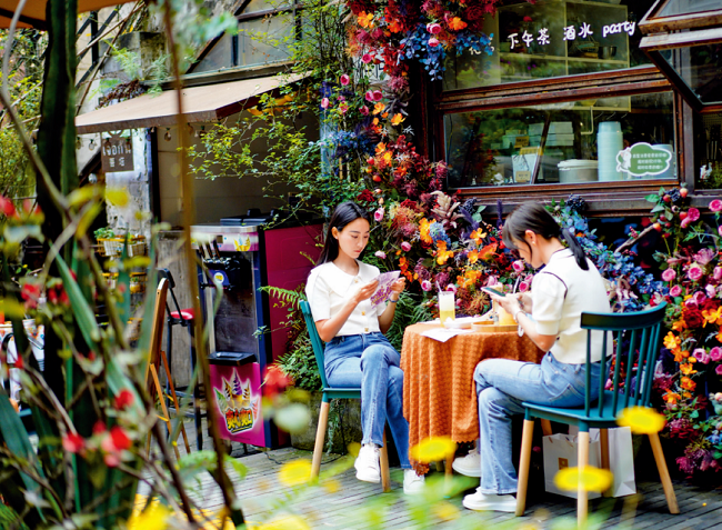 ▲ 游客在在重庆北仓文创街区内一家充满文艺气息的饮料店小憩(4月22日摄) 刘潺摄