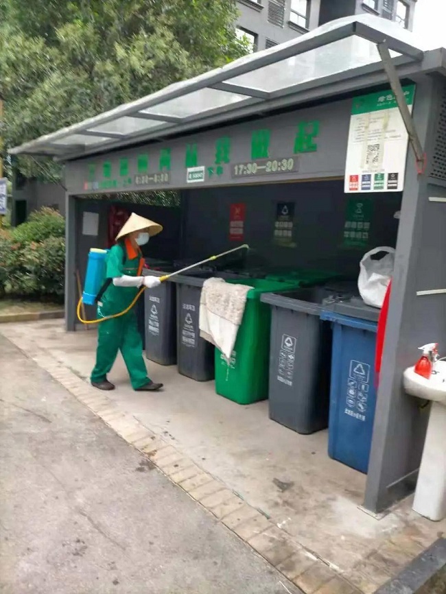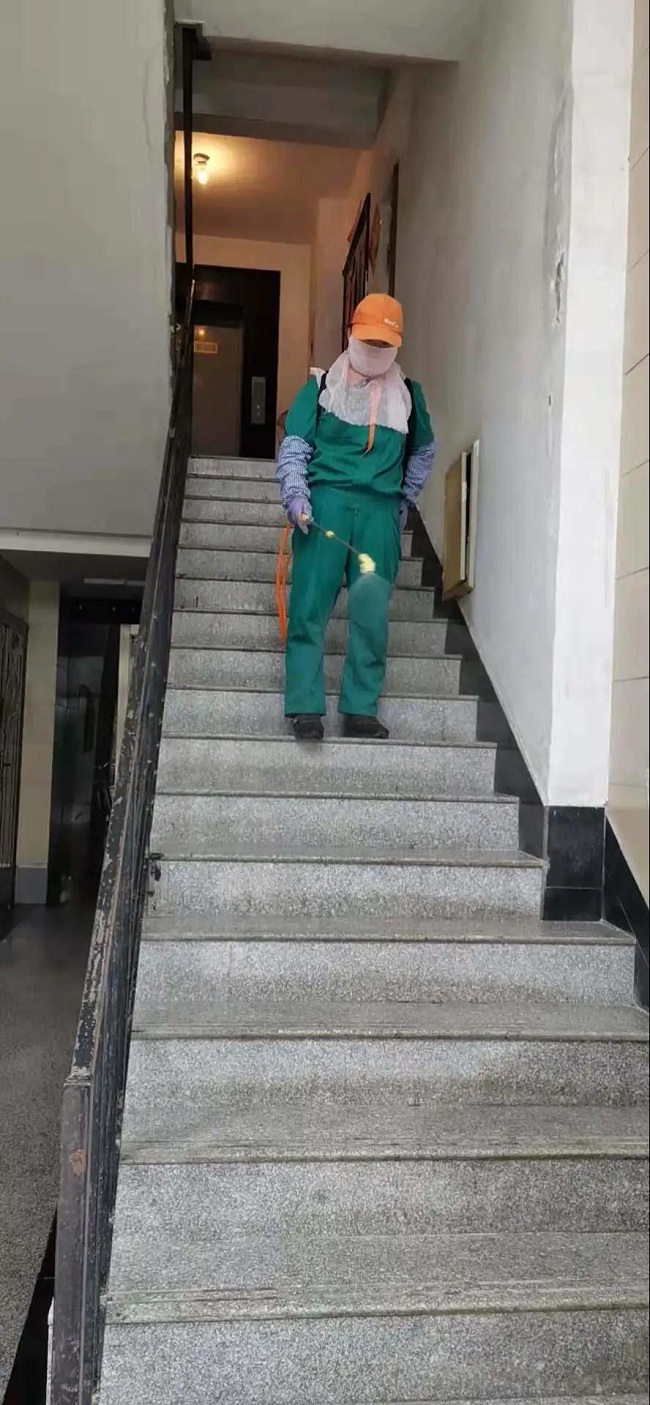 江苏徐州某物业公司成立消杀工作和门岗督查小组,每日提前1小时到岗,在主出入口、电梯轿厢、卫生间、垃圾桶这种重点部位进行提前消杀。保洁员先用扫把、抹布、尘推除去明显的污渍,再用按比例稀释后的84消毒液进行多方位、高密度的喷撒,确保消杀无死角,不给病毒留下藏身之地。