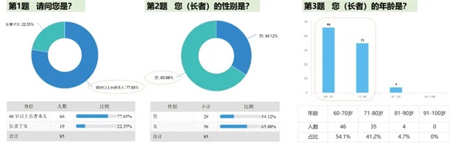 有效问卷的受访老人占项目老年人数的8.6%,80岁以内占比超95%,具有较高代表性与可信度。长者本人填写66份,占比77.7%,其中,男性占比34.1%,女性占比66.9%,女性受访者参与度较高。样本年龄分布与项目长者情况基本一致。