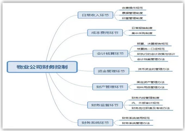 一是完善财务内控体系。近年来物业服务企业逐步向多元化发展的趋势,物业服务企业的经营规模也不断发展,所涉及的业务量、资金量都呈上升趋势,不再是传统意义上的仅仅收取物业费的模式,物业管理项目分散、人员素质不高、管理目标不统一、市场竞争激烈等因素都是物业财务管理的难点。因此,系统化的建立财务管理模式是贯彻于物业服务企业整个经营活动之中,是确保物业服务企业经济利益的同时,规范物业财务相关环节的制度保障。结合物业服务企业经营管理流程,实际表明物业服务企业所需的内控管理环节应大致包括如下几方面: