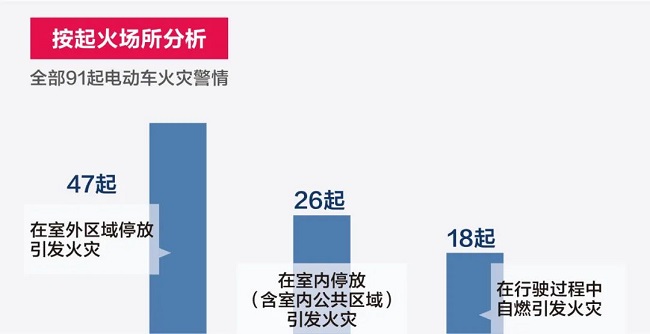 一项对近年来91起电动自行车火灾事故的对比统计显示,室外区域停放时发生火灾47起,占比52%;在室内停放发生火灾26起,占比28%;在行驶过程中发生火灾18起,占比20%。由此可见,在停放和充电时(室内外)发生火灾占比达到80%,这表明物业管理应重点对电动自行车停放与充电进行管理。