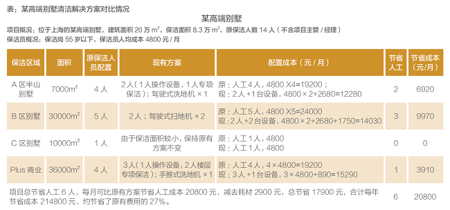 这三方面的特征为住宅物业、商业物业等物业项目的优化提升带来质的变化。以某高端别墅为例,由于项目占地面积大,环境较简单,重复劳动较严重,人员流动较频繁,人工成本居高不下,但在引入智慧清洁解决方案后,此项目实现了以下四个方面的优化提升: