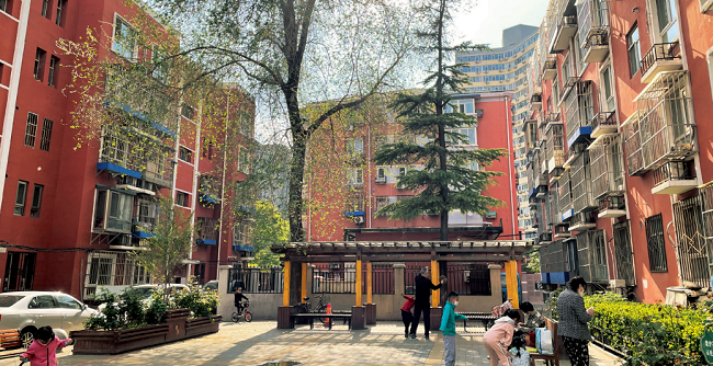 4月底,刚刚落过一场春雨,天朗气清,空气湿润,绿树摇曳,春日的北京一片生机盎然。在双旗杆东里小区的胡同口,数棵一人怀抱的白杨树高耸如入云,把绿荫抛洒在红墙楼房上,这似乎也在彰显岁月的痕迹。笔者在这里见到了王培莉女士和韩桂鑫女士两位业主,听她们说说老旧小区的改变。
