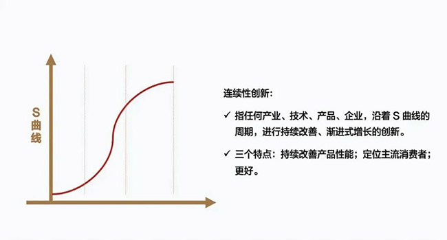 李善友在《第二曲线创新》中,对创新模式进行了分类:创新模式有两种:一种是在原有曲线上的持续改进;另一种是两条曲线转换期间的非连续性创新。连续性创新是指任何产业、技术、产品、企业,沿着S曲线的周期,进行持续改善、渐进式增长的创新,也常称为延续性创新”“渐进式创新”“积累性创新等。
