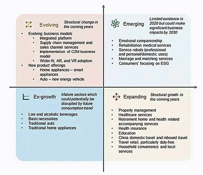 从摩根士丹利的投资框架可以看出:随着中国的消费市场增长从实物驱动转向服务驱动,而且关注点从年轻人的消费转向家庭需求和退休计划,我们预期各行各业也会有相应的变化。为了更好地分析这些变化,我们把诸多的行业基于他们的产品线和行业变化的驱动力,分为四个大的类别: