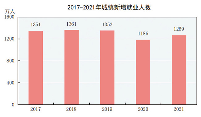 一方面,《2021年国民经济和社会发展统计公报》数据显示,2021年末全国就业人员74652万人,其中城镇就业人员46773万人,占全国就业人员比重为62.7%20172019年,我国城镇新增就业人数均在1350万人以上,而2020年受疫情影响,城镇新增就业人数下降至1186万人,2021年有所上升,为1269万人。