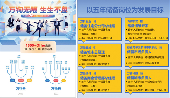今年4月,万物云启动“2022届校园招聘活动,这已经是万物云第17届招聘应届高校毕业生活动,该招聘活动的前16届共招聘应届高校毕业生4990多名。此前的20202月,万物云曾启动一个20000人的大型招聘计划,招聘岗位涵盖物业安保、保洁及保修,房产经纪和装修,数字化产品及开发,物业专家,市场及营销,财务、投资及人力等六大类。这次招聘活动被冠以长江行动总称,并由其首席执行官朱保全担任组长。