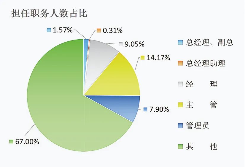 担任职务:担任总经理、副总、总助职务的36人,占比1.88%;担任经理、主管职务的444人,占比23.22%;担任管理员及其他职务的1432人,占比74.90%(如图2所示)。