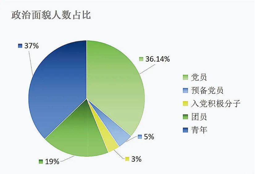 政治面貌:党员人数691人,占比36.14%;预备党员人数84人,占比4.39%;入党积极分子64人,占比3.35%;团员361人,占比18.88%;群众712人,占比37.24%(如图1所示)。