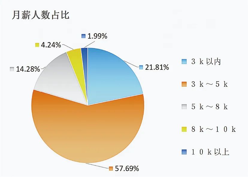 经济收入:月薪1万元以上的38人,占比1.99%;月薪8000-10000元的81人,占比4.24%;月薪5000-8000元的273人,占比14.28%;月薪3000-5000元的1103人,占比57.69%;月薪3000元以下的417人,占比21.81%(如图4所示)。将近一半的退役军人达到了当地平均工资水平,而另一半人员的薪资待遇需要进一步提升。