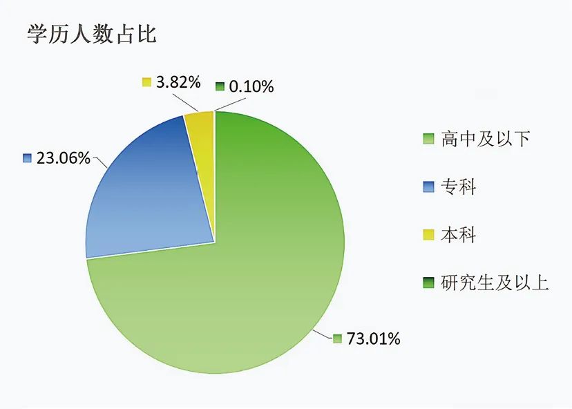 学历教育:研究生及以上学历的2人,占比0.10%;专科以上学历514人,占比26.88%;高中及以下学历1396人,占比73.01%(如图5所示)。从中可以看出,与经济社会发展水平相比,学历教育还有较大提升空间。