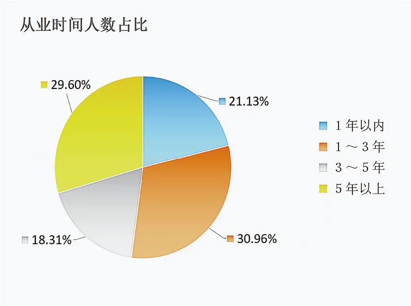 从业时间:在物业管理行业工作5年以上的566人,占比29.60%;工作5年以下1年以上的942人,占比49.27%;工作1年以下的404人,占比21.13%(如图6所示)。退役军人一旦入职物业服务企业,绝大多数能够沉下心来钻研业务、深耕行业,起到模范带头作用,体现了吃苦耐劳、稳扎稳打的优良作风。
