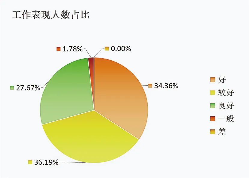 工作表现:企业人力资源部门对绝大多数退役军人的工作表现给予了正面评价。其中,工作表现好的657人,占比34.36%;工作表现较好的692人,占比36.19%;工作表现良好的529人,占比27.67%;工作表现一般的34人,仅占1.78%;没有人被评为差等(如图8所示)。