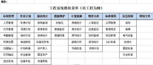 其中模块(以工程为例)包括:年度计划设定、月度重点工作设备年检信息推送、报(维)修管理、作业查询、报表统计、标准规范、应急预案、固定资产设备管理、物资采购仓库管理、计量能源、劳防发放、输入输出等模块(详见附表)。