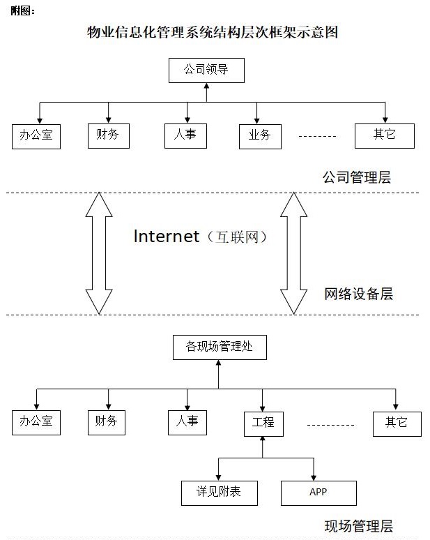 在物业信息化管理中,管理内容覆盖物业公司所有管理系统和层次。如:OA、财务、人事、业务、工程(保洁、保安、餐饮、会务、客房)等系统层次(详见附图)。