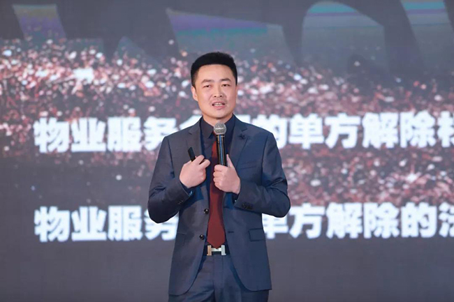 中国物协法律政策工作委员会委员、法眼云律网络集团董事长周华斌作《物业企业与业委会共建和谐社区新模式》的主题演讲,他给大家讲解了有关于物业服务合同的单方解除所带来的法律后果,分析阐明了业主的各项权利,以及物业公司所处的局面,强调物业公司更应加强学习、管理,明确自己的义务与责任,通过服务、管理、经营三者之间的关系,促进和谐社区的发展,周董事长还强调2020年法眼集团将在全国范围内开展200场主题为“美好社区生活”的公益巡回演讲。