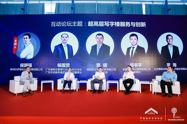 在深圳玖伊绿色运营管理有限公司总经理侯国强的主持下围绕着“超高层写字楼服务与创新”这一话题广东省物业管理行业协会执行会长、广东华信服务集团有限公司董事长杨国贤,西安创业物业发展有限公司董事总经理贾砺,新疆广汇物业管理有限公司董事长郑书平,北京博锐尚格节能技术股份有限公司副总裁常海分别就超高层物业管理和服务为行业带来的挑战、机遇和应对方式进行了经验分享和总结。