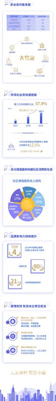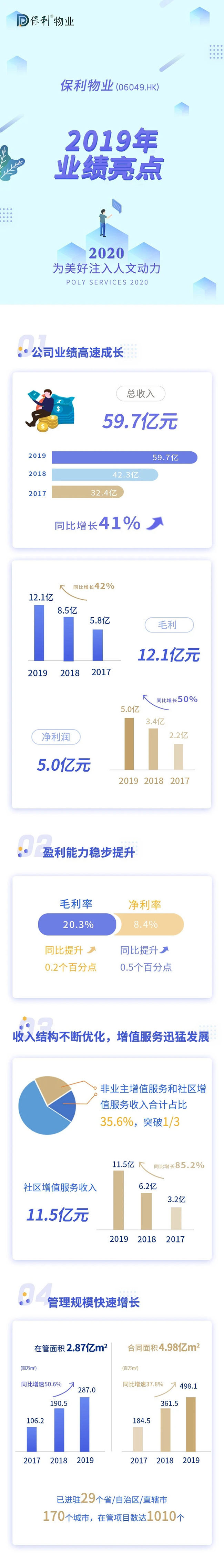 2020年3月25日,保利物业发布2019年全年业绩公告。数据显示, 2019年营收59.67亿,同比提升 41.1%。净利润5.03亿,同比提升49.7%。归母净利润4.91亿,同比提升49.3% ,收入利润高速成长。面积规模方面,合同面积同比提升37.8%至4.98亿方,在管面积同比提升50.6%至2.87亿方。全年业绩高速成长,规模快速发展,第三方拓展能力凸显,公共服务竞争优势显著、营收结构不断优化。提出“大物业战略”的保利物业,在物业服务实践中接轨社会治理,展示新时代物业的新价值。