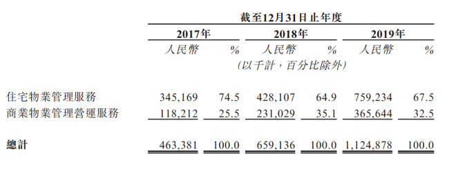 从合景悠活披露的营收数据来看,其住宅物业管理服务板块与商业物业管理运营服务板块收入正日趋平衡。2017年到2019年,住宅物业管理服务板块与商业物业管理运营服务板块收入占比分别74.5%、25.5%;64.9%、35.1%;67.5%、32.5%。