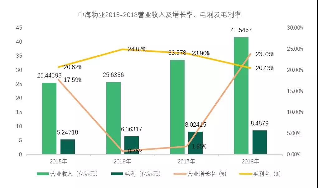 相较于2017年,2018年,中海物业营业收入、经营利润增幅分别达到23.7%、27.5%,其中营业收入增加7.97亿港元至41.55亿港元。