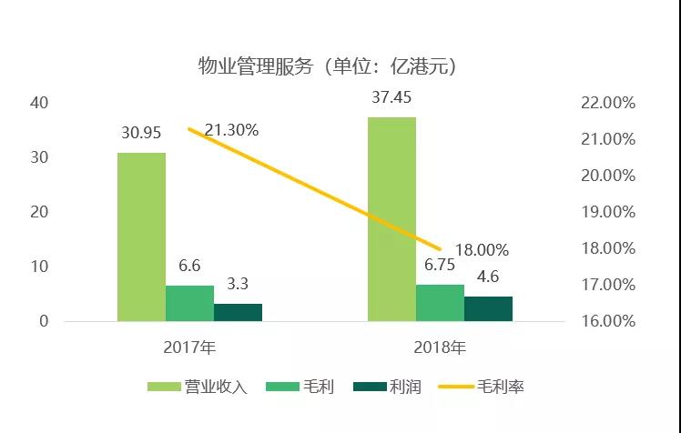 其中,物业管理服务,2018年营收较2017年上升21%至37.45亿港元,占总营收的90.1%;毛利上升2.2%至6.75亿港元,毛利率受人力架构调整管理费用增加等影响,由2017年的21.3%下降至18.0%。