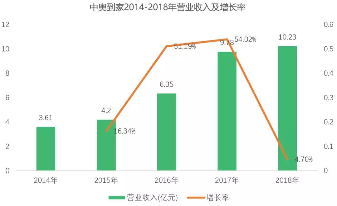 据年报数据显示,2018年中奥到家实现营业收入10.23亿元,同比增长4.7%;毛利为2.82亿元,同比下降5%;年内利润1.07亿元,同比增长7.7%;毛利率为27.6%,同比下降2.8个百分点;净利润率为10.5%,同比上升0.3个百分点。