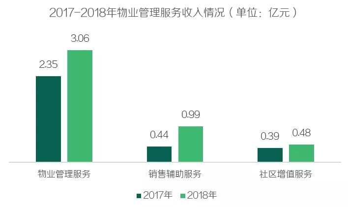 2018年,物业管理服务收入约为4.5亿人民币,其中物业管理服务收入增加约人民币7090万元,及销售辅助服务收入增加约人民币5500万元。销售辅助收入同比增加了125.3%,主要是因为物业项目同比增加了39个。物业管理服务收入同比增加了30.2%,主要是因为在管面积同比增加了21%