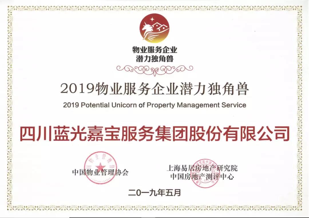 蓝光嘉宝荣获“2019物业服务企业潜力独角兽”。