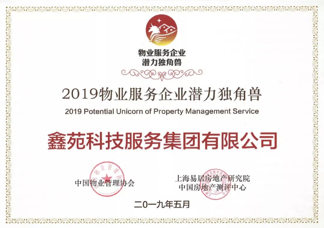 鑫苑科技服务集团荣获“2019物业服务企业潜力独角兽”。