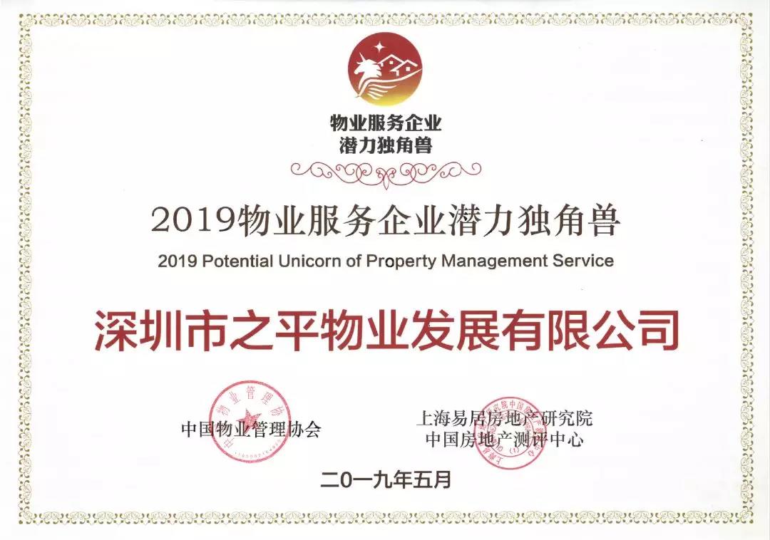 深圳市之平物业发展有限公司荣获“2019物业服务企业潜力独角兽