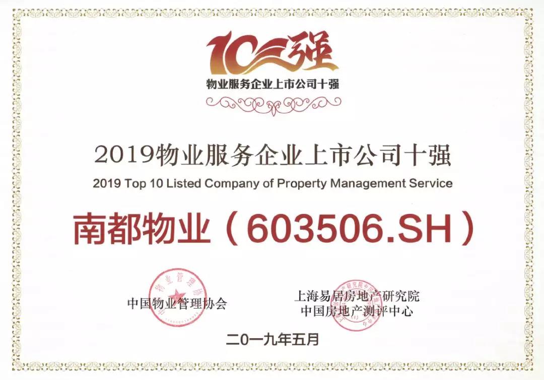 南都物业荣获“2019物业服务企业上市公司10强”。