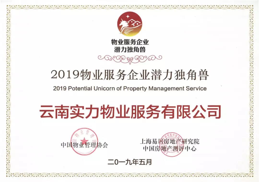 云南实力物业服务有限公司荣获“2019物业服务企业潜力独角兽