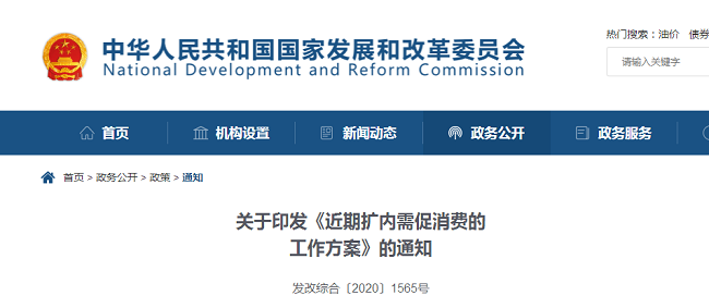 为贯彻落实党中央、国务院关于做好下半年经济工作的各项安排部署,下大力气抓好“六稳”工作、落实“六保”任务,进一步扩大内需特别是有效促进消费,推动经济供需循环畅通,促进形成强大国内市场,国家发展改革委会同有关部门共同研究制定了《近期扩内需促消费的工作方案》。现印发给你们,请结合实际,认真抓好贯彻落实。