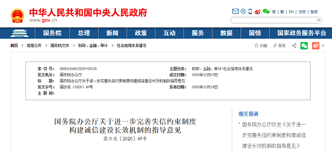 国务院办公厅:关于进一步完善失信约束制度构建诚信建设长效机制的指导意见