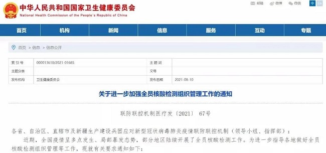 近期,全国疫情呈多点发生、局部暴发态势,部分地区陆续开展了全员核酸检测工作。为进一步指导各地做好全员核酸检测组织管理等工作,现就有关要求通知如下: