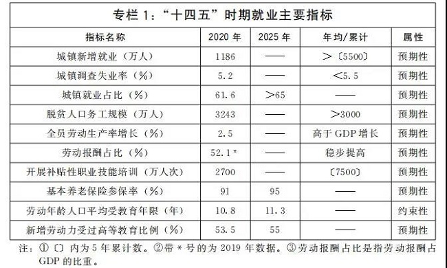 “十四五”时期是我国全面建成小康社会、实现第一个百年奋斗目标之后,乘势而上开启全面建设社会主义现代化国家新征程、向第二个百年奋斗目标进军的第一个五年。当前和今后一段时期,我国发展仍然处于重要战略机遇期,党中央、国务院高度重视就业问题,实施就业优先战略,为实现更加充分更高质量就业提供了根本保证;我国已转向高质量发展阶段,以国内大循环为主体、国内国际双循环相互促进的新发展格局加快构建,经济稳中向好、长期向好,为就业长期稳定创造了良好条件;新一轮科技革命和产业变革深入发展,新兴就业创业机会日益增多;新型城镇化、乡村振兴孕育巨大发展潜力,新的就业增长点不断涌现;劳动力市场协同性增强,劳动力整体受教育程度上升,社会性流动更加顺畅,为促进就业夯实了人力资源支撑。