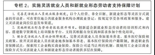 支持多渠道灵活就业和新就业形态发展。破除各种不合理限制,建立促进多渠道灵活就业机制,支持和规范发展新就业形态。鼓励传统行业跨界融合、业态创新,增加灵活就业和新就业形态就业机会。加快落实《关于维护新就业形态劳动者劳动保障权益的指导意见》,建立完善适应灵活就业和新就业形态的劳动权益保障制度,引导支持灵活就业人员和新就业形态劳动者参加社会保险,提高灵活就业人员和新就业形态劳动者社会保障水平。规范平台企业用工,明确平台企业劳动保护责任。健全职业分类动态调整机制,持续开发新职业,发布新职业标准。