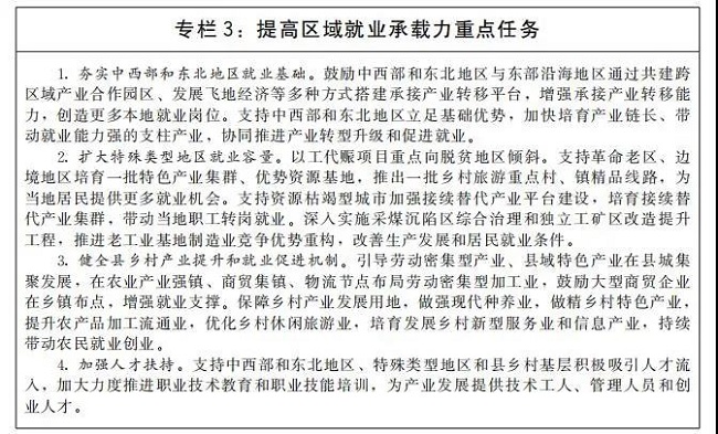 推动区域就业协调发展。支持东部地区发挥创新要素集聚优势,率先实现产业升级,开拓高质量就业新领域,培育高质量就业增长极。加快完善中西部和东北地区基础设施,提升产业集聚区公共服务效能,引导产业向中西部和东北地区有序梯度转移,推动就业机会向中西部和东北地区扩散。支持中西部和东北地区根据国家战略导向和发展重点,对接先进生产要素和创新资源,发展特色优势产业,改造提升传统产业,积极布局新兴产业,厚植就业创业沃土。