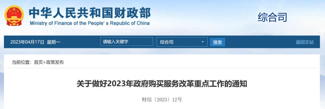 政府购买服务改革是党中央、国务院部署的一项重要改革工作。2022年各地各部门持续深化政府购买服务改革,全国政府购买服务支出规模近5000亿元,在中央部门所属事业单位开展了改革,各地在助力疫情防控、保障和改善民生等领域也取得显著成效。2023年是全面贯彻党的二十大精神的开局之年。为更好地贯彻落实党中央、国务院重要决策部署,通过政府购买服务改革政策更加有力地服务党和国家重大战略,现就做好2023年政府购买服务改革重点工作有关事项通知如下: